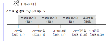 ▶피보험자가 통원하여 치료를 받던 중 보험계약이 종료되더라도 그 계속 중인 통원에 대해서는 다음 예시와 같이 보험계약 종료일 다음날부터 180일 이내의 통원을 보상하며 최대 90회 한도 내에서 보상합니다.