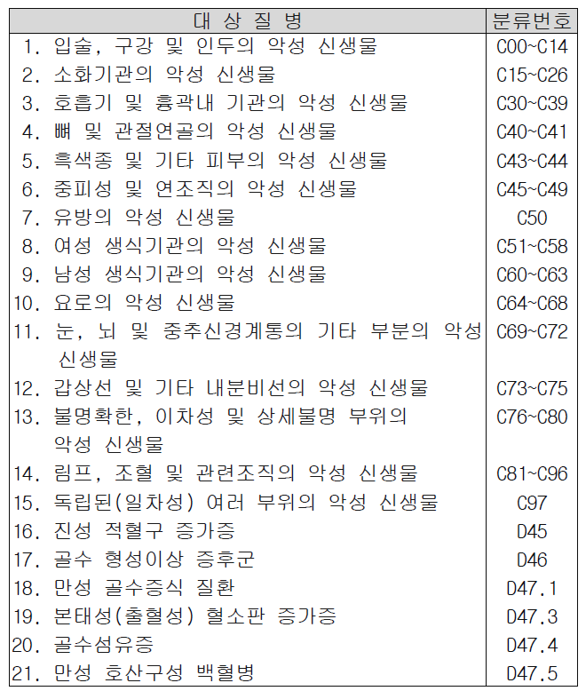 ※ 제7차 개정 이후 한국표준질병·사인분류에 있어서 위의 분류표에 변경사항이 발생하는 경우에는 변경된 분류표에 따