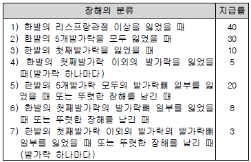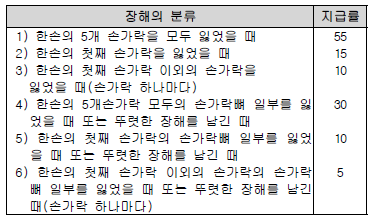 1) 하나의 장해가 관찰방법에 따라서 장해분류표상 2가지 이상의 신체부위 또는 동일한 신체부위에서, 하나의 장해에 다른 장해가 통상 파생하는 관계에 있는 경우에는 각각 그 중 높은 지급률만을 적용한다.