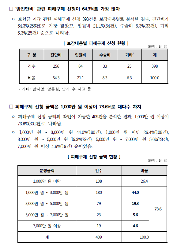 ‘암보험금 지급’ 피해구제 신청 398건 중에서는 ‘진단비’ 관련 피해구제 신청이 전체의 64.3%(256건)로 가장 많았고, 이어서 ‘입원비’ 21.1%(84건), ‘수술비’ 8.3%(33건) 등의 순이었다. 피해구제 신청 금액*은 1천만 원 이상인 경우가 73.6%였고, 당사자 간 합의가 이루어진 경우**는 27.4%에 불과했다.