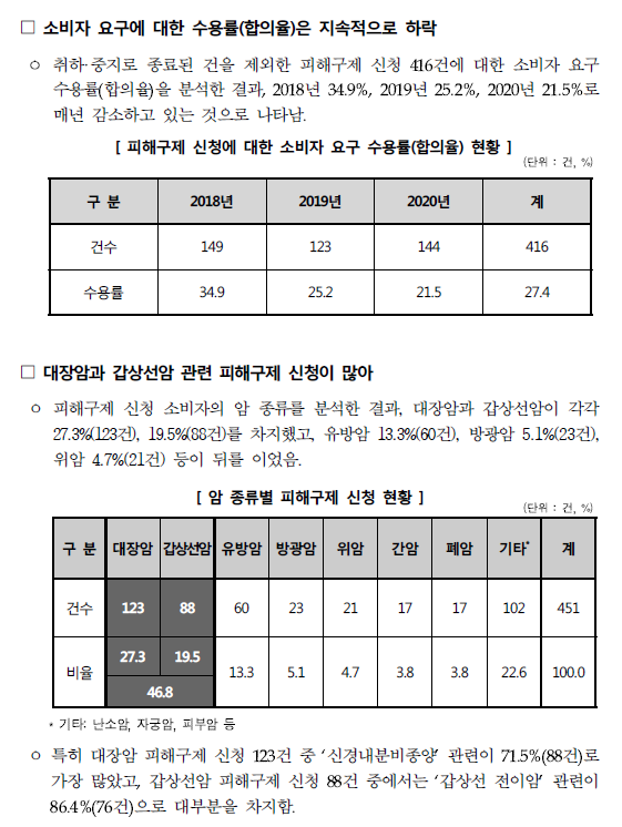 한편, 암 종류별로는 ‘대장암’, ‘갑상선암’ 관련 피해구제 신청이 각각 전체의 27.3%(123건), 19.5%(88건)를 차지했고, 이어 ‘유방암’ 13.3%(60건), ‘방광암’ 5.1%(23건) 등이 뒤를 이었다*.