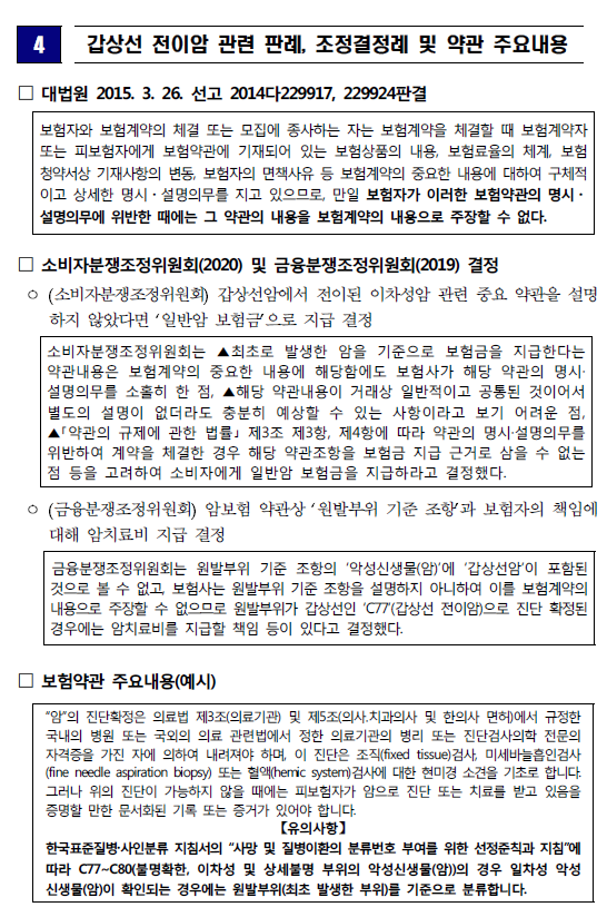 - 보험사는 해당 보험약관에 따라 최초 발생한 갑상선암이 소액암*이므로 갑상선암(C73) 에 대한 소액암 보험금만 지급하고, 갑상선 전이암(C77)에 대한 일반암 보험금를 지급하지 않음.