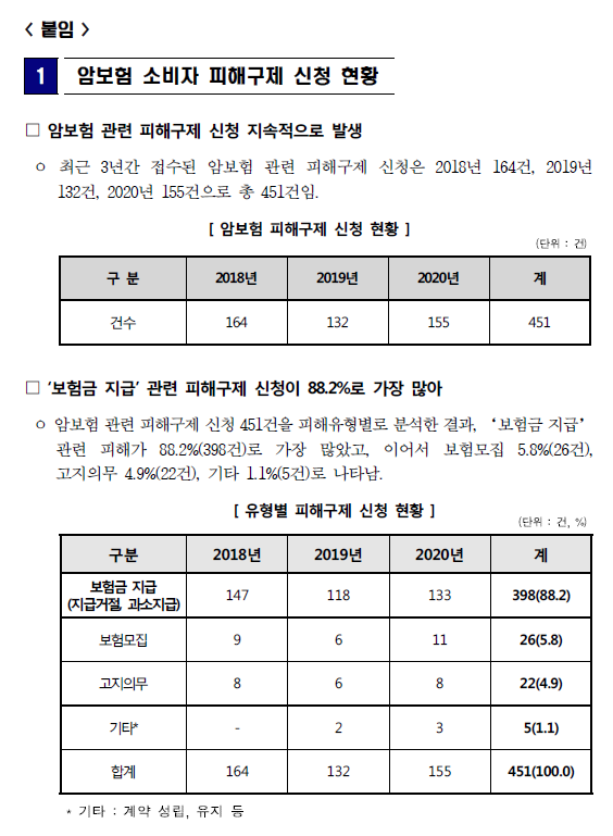 한국소비자원(원장 이희숙)이 최근 3년간(‘18 ~ ‘20년) 접수된 암보험 관련 피해구제신청 451건*을 유형별로 분석한 결과, 보험금 지급을 거절하거나 과소 지급하는 등의 ‘암보험금 지급’ 관련 피해구제 신청이 88.2%(398건)로 대부분을 차지했다.