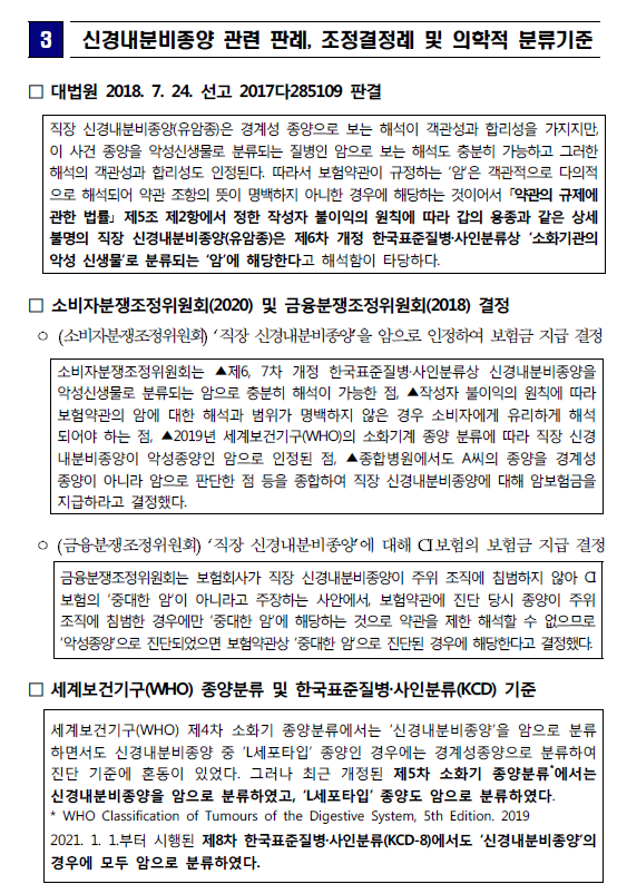 최근 세계보건기구(WHO)가 제5차 소화기 종양분류에서 ‘신경내분비종양’을 악성종양으로 분류하고, 제8차 한국표준질병·사인분류(KCD-8)에서도 동일하게 개정(’21년 시행)되어 보험사는 경계성종양 보험금이 아닌 일반암 보험금을 지급해야 한다.